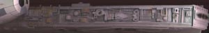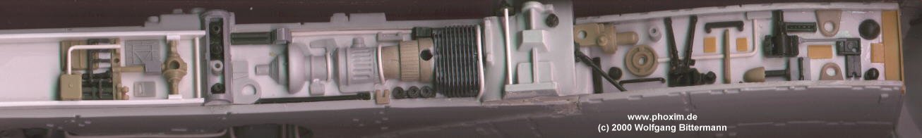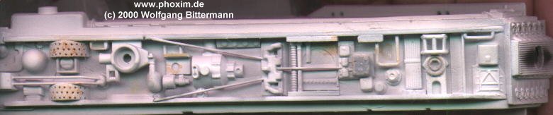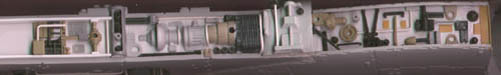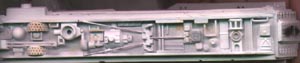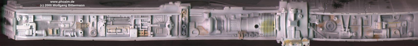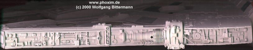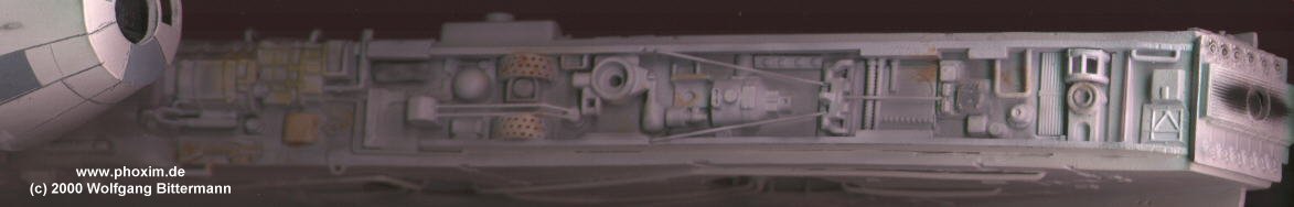 Als ich begann die Seitenwände mit Kleinteilen aus anderen Bausätzen zu detaillieren, hatte ich noch kein gutes Bildmaterial. Ich hatte weder die Star Wars Chroniken noch die Behind the Magic cd-rom. Einen Internetanschluss hatte ich zu dieser Zeit auch nicht. Auf meinem Bildmaterial konnte ich zwar die Aussenwände der Bugspitzen gut erkennen, alle anderen Seitenwände jedoch nicht. Entweder sie lagen auf der Fotographie im Dunkeln oder sie waren garnicht zu sehen. Also musste ich alle Kleinteile auf "gut Glück" ankleben, was mich heute sehr ärgert. Lieber hätte ich gute Vorlagen gehabt. Das kunterbunte, confuse Aussehen verschwindet nach der Grundierung und man kann nicht mehr erkennen, dass die Wand aus vielen kleinen Einzelteilen besteht. |