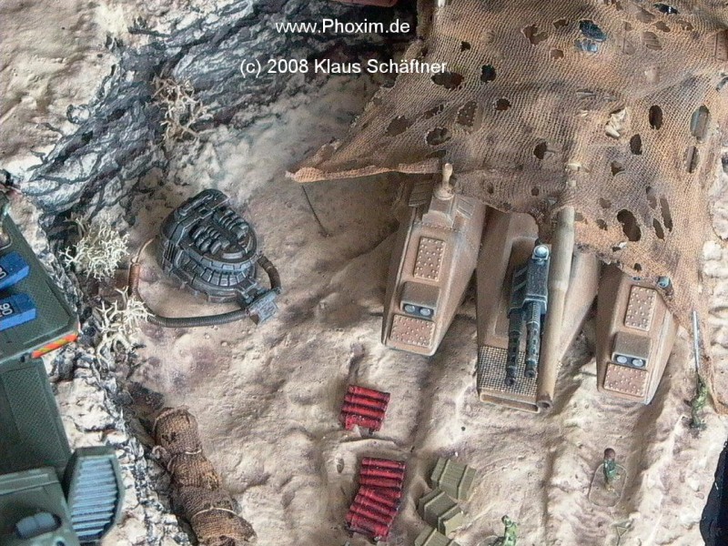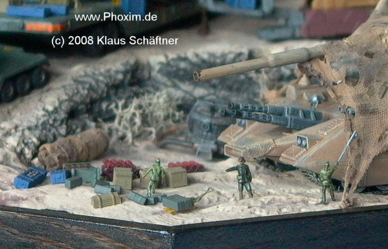 Im Vordergrund, unter einem Tarnnetz verborgen, erkennen wir einen Magella Battle Tank,