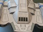 Daher habe ich versucht, das Farbschema anhand der wenigen Infos exakt wiederzugeben. So hat das Schiff ebenfalls eine komplizierte Grauschattierung, ähnlich den bekannten Aztec-Mustern der Enterprise. Im Moment arbeite ich noch an der Bauanleitung, aber bald kann das Modell auf meiner Webseite heruntergeladen werden. |