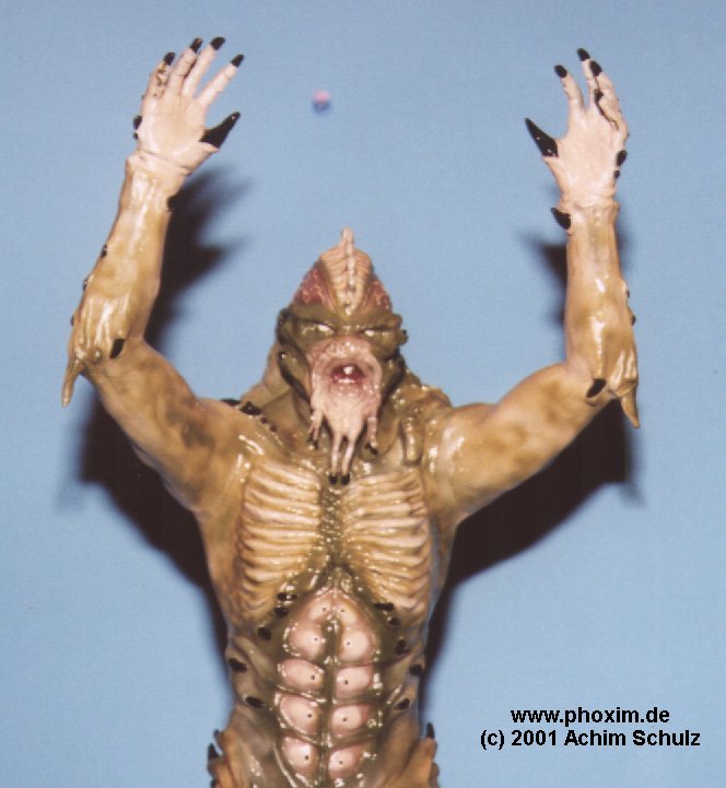 Dieser nette Bursche den ihr hier seht ist aus dem Film "Subabian Command - Der Ritter aus dem All" mit dem Wrestlingstar Hulk Hogan in der Hauptrolle. Diese Figur von der Firma Screamin` ist aus giftgrünem Vinyl und ca.45cm hoch! Die Figur wurde auch hier wieder mit Gips ausgegossen. Grundiert in Grau und mit verschiedenen Grüntönen durch das Airbrush bemalt. An einigen Stellen wurde die Figur mit Glanzlack besprüht, um einen schleimigen Eindruck zu vermitteln. Leider ist die Figur nicht mehr im Handel zu bekommen, denn sie ist eine Bereicherung für jeden Monsterfan. |