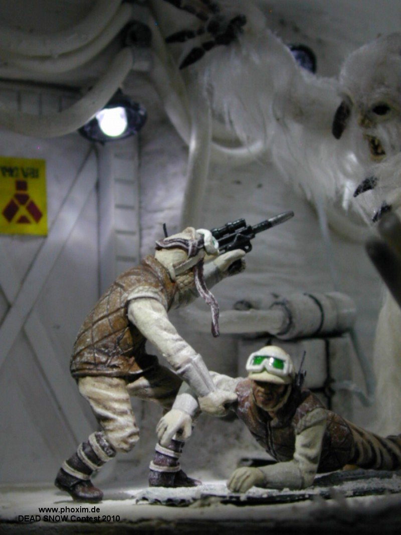 Den Blaster des Schützen habe ich aus Einzelteilen der Restekiste gescratcht und beide Figuren mit verschiedenen Revell- und Humbrolfarben bemalt. Am Schluß wurde alles noch etwas mit Weiß „trockengemalt“ , was einen schönen „Frost“-effekt ergab. |