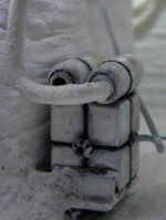 Der ganze Korridor wurde dann mit einer Moltofil-Holzleim-mischung bestrichen und vor dem Trocknen mit einem Plastikmesser als "Zahnspachtel" die Struktur der Eiswände eingeritzt. Am Schluß habe ich alles mit Dispersionsfarbe mit ein paar blauen Aquarell-Akzenten bemalt. Außerdem wurden an den Wänden die auf der Echo-Basis im Film allgegenwärtigen Kabelschläuche angebracht. Da diese nach hinten ebenfalls schmäler werden mußten, um die Perspektive eines langen Laufganges zu unterstützen, habe ich aus „Fimo“ ein paar Würste gerollt, die an einem Ende dünner ausliefen. Diese wurden dann entsprechend der Aufhängungspunkte an der Korridorwand auf einem Holzbrettchen in Bögen geformt und im Backrohr gehärtet. |