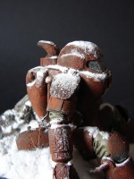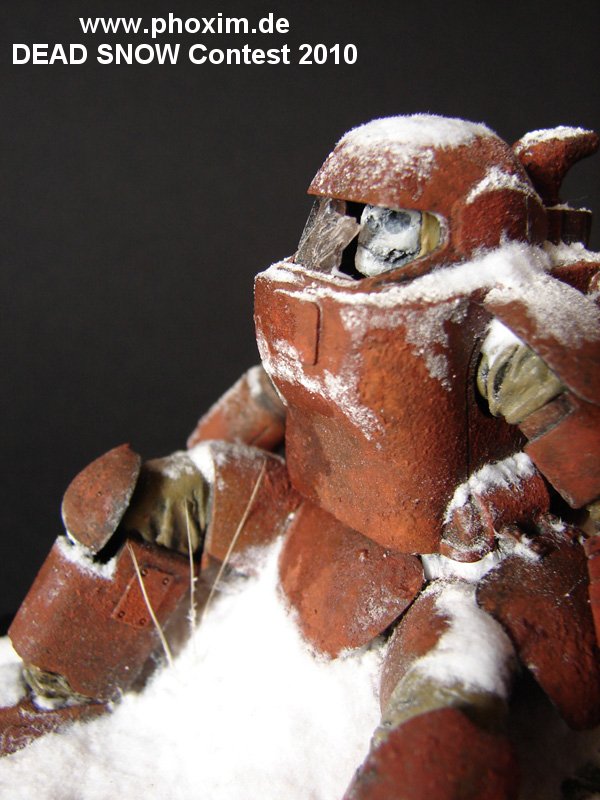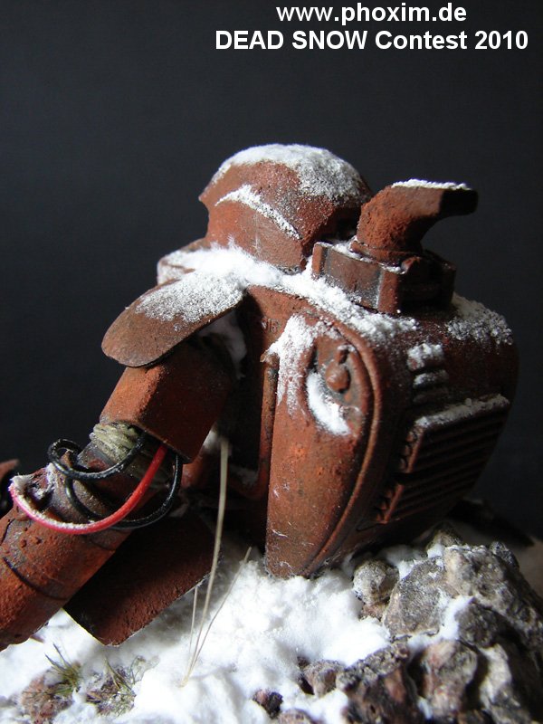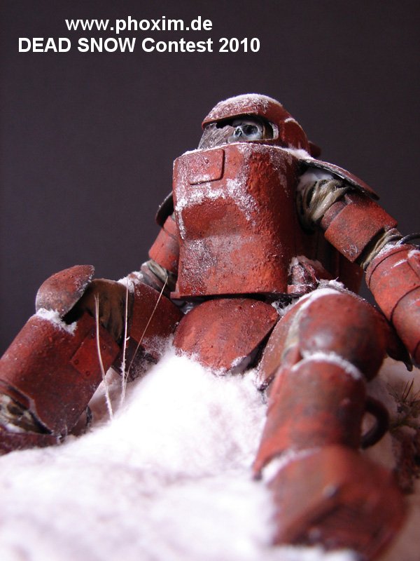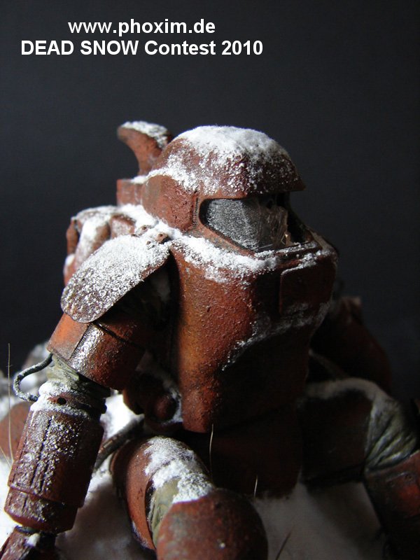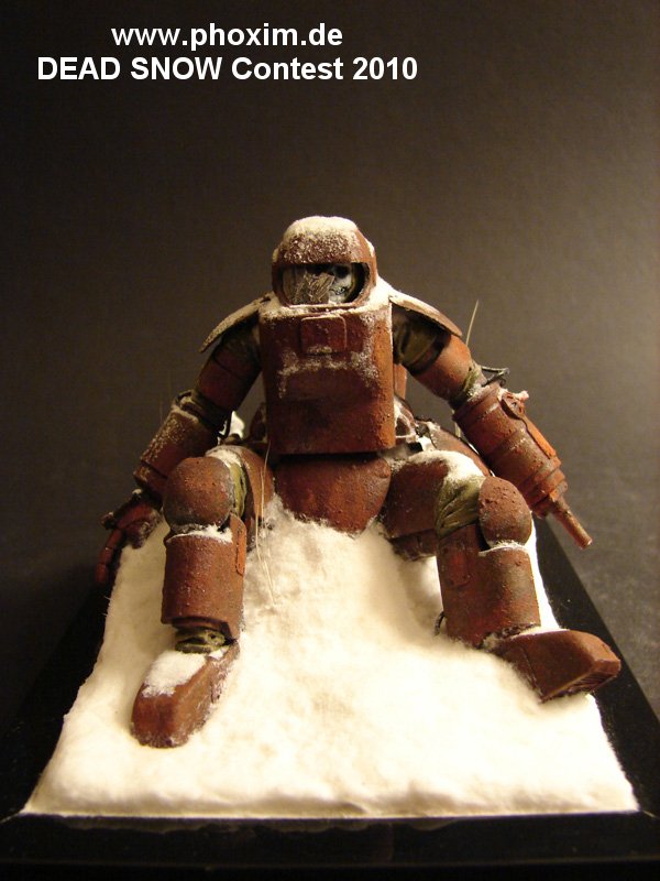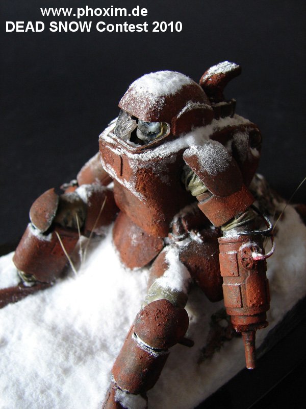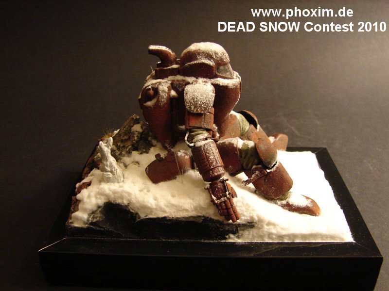 Theres no buisness like snow buisness… Zur Darstellung der Schneefläche nutzte ich den Schnee von Games Workshop. Zuerst rührte ich eine Wasser / Weißleim Mischung an, etwa 50/50 in die ich großzügig den Schnee einrührte. . Nachdem das alles zu einer homogenen Pampe verrührt wurde konnte es mit einem kleinen Spachtel in mehreren Lagen auf die Oberfläche auf-modelliert und zwischendurch auch immer mal wieder etwas bestreut werden. Da dies meine erstes Dio mit Schneedarstellung ist wollte ich auch gleich die Backpulver Variante noch testen um den Schnee auf dem Suit darzustellen. |