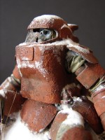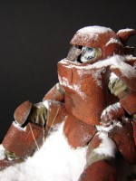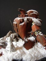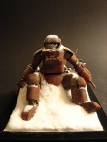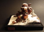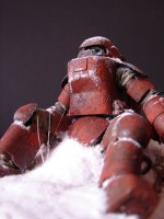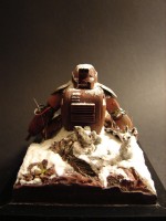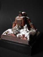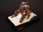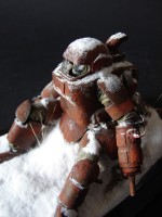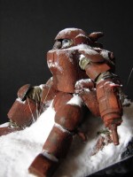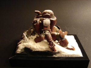 Step5 Base it! Die Base wurde aus einem Rahmen mit den Maßen 13x18cm erstellt, welcher in mehreren Schichten mit Modelliergips aus dem Baumarkt aufgefüllt wurde. Die Anhöhe und der Steinbrocken wurden ebenfalls mit Gips aufmodelliert und nachdem das Suit eingepasst wurde, mit ein paar Dekosteinchen bestreut. Nachdem alles gut durchgetrocknet war konnte das Erdreich bemalt werden. Flächen, die später schneebedeckt sein sollten, wurden weiß grundiert. |