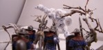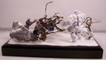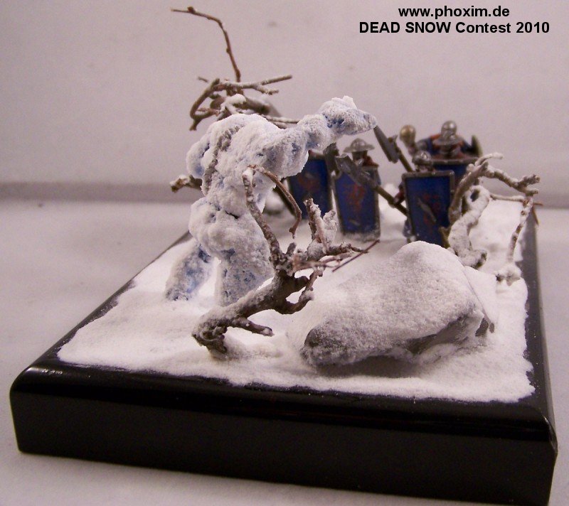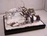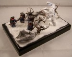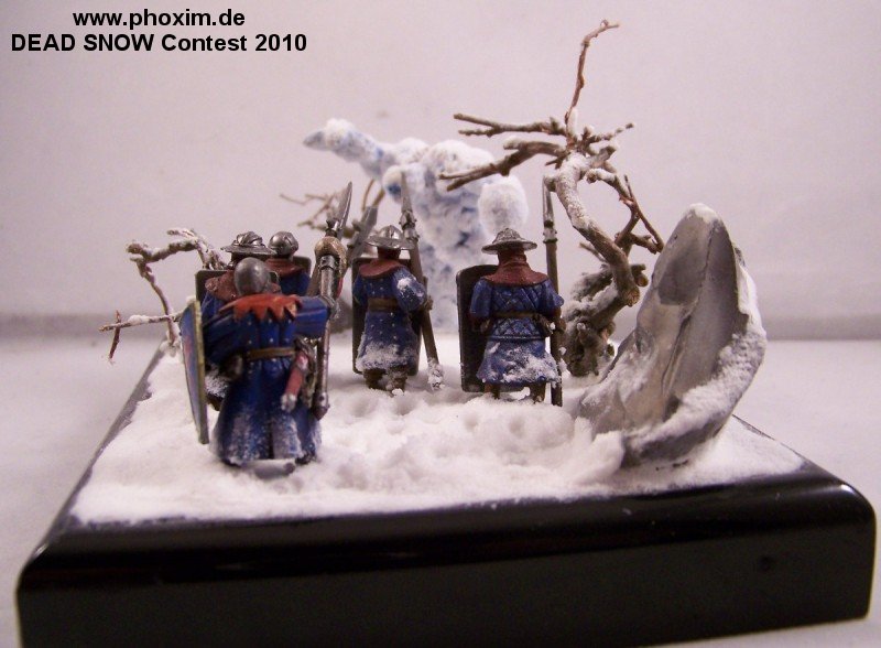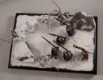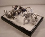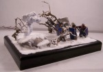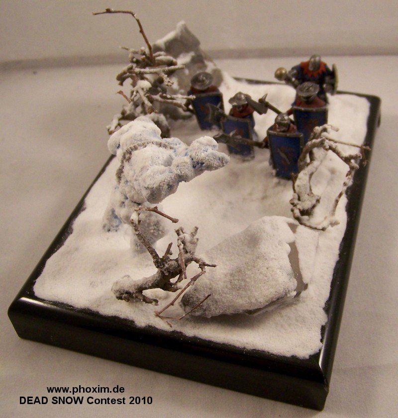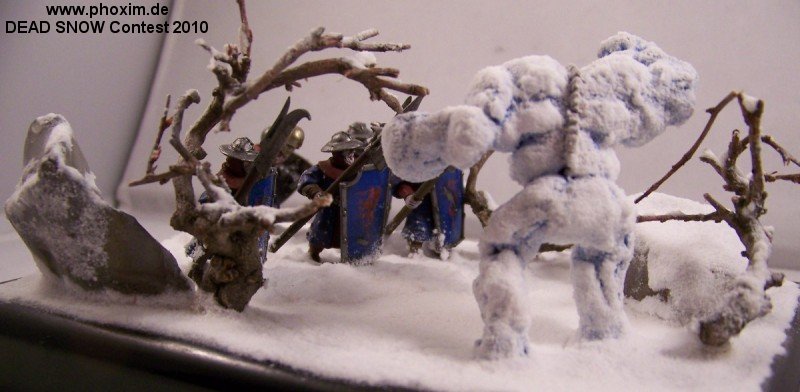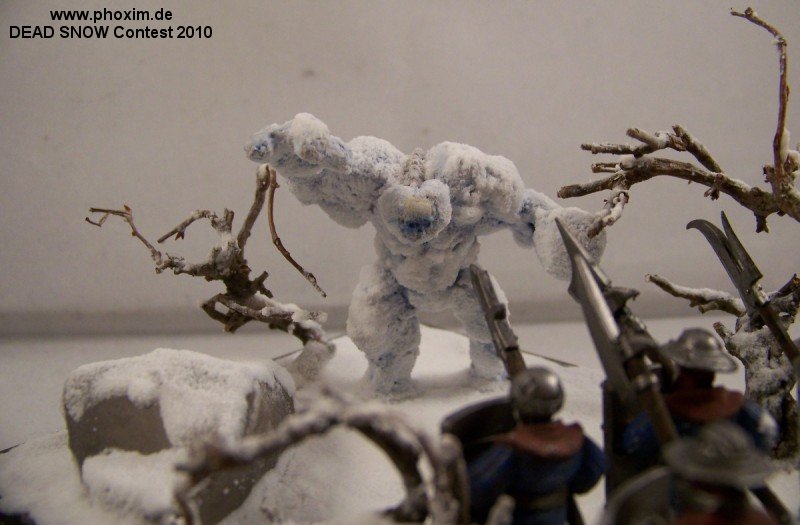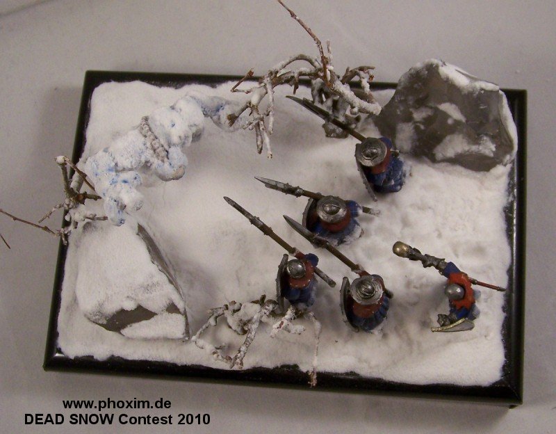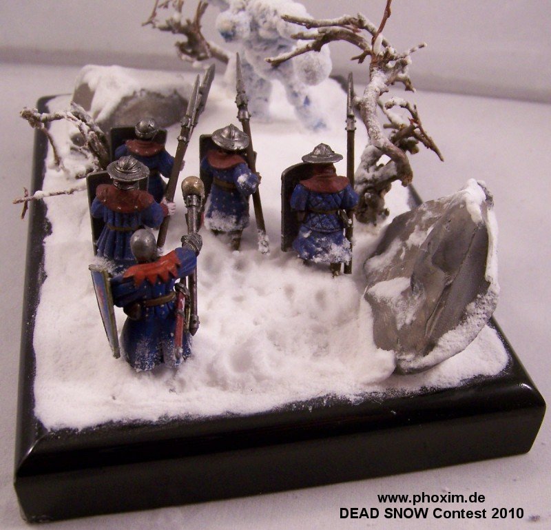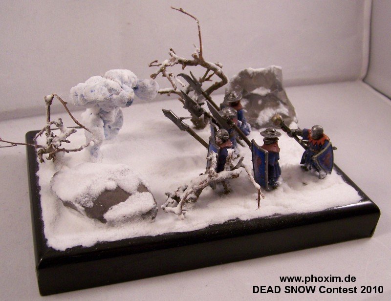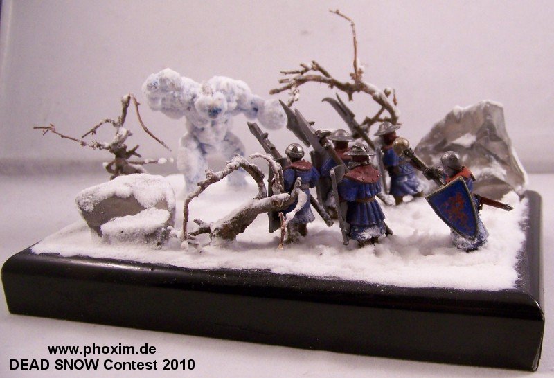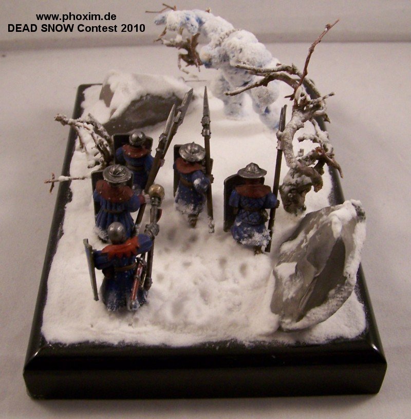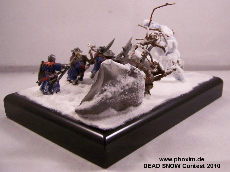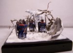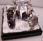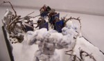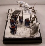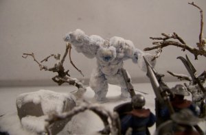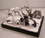 The diorama depicts a battle-wizard and few of his men encountering a snow-golem. Snow-golems are nigh-on indestructible in cold regions, only severe damage to the human parts used to give it life (usually a skull and spine) can take it down. The men in the diorama can be counted as dead. |