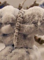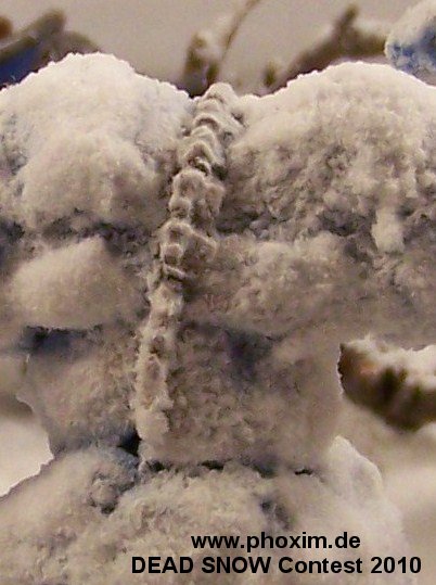Paint: The golem was painted white, then blue from dark to light with a final few coats of white. The blue of the base layer shines through in the lower areas, to emphasize magic and coldness. I tried to do some source lighting on the eyes of the skull, but not to successful. The whole model, except the spine and skull, was covered in glue and snow, some of which was brushed off later. |