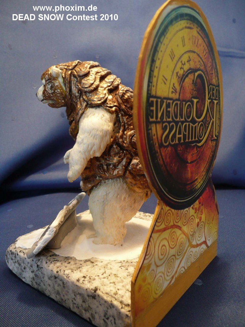 Als ich mit dem Ergebnis soweit zufrieden war stellte ich Iorek in einen großen Patzen weißer Acrylfarbe – das war der Schnee. Gleichzeitig hat ihn das angeklebt. Jetzt kam das gegoogelte Bild zum Zuge. Das Cover einer DVD von „Der goldene Kompass“. Ich hab’s mir 2 x in Farbe ausgedruckt, einmal davon gespiegelt, und auf die 2 Seiten einer dünnen Kunststoffplatte geklebt die ich aus der Restekiste einer Ex-Firma hatte. Nachdem ich es auf eine Kreisform mit Ständer um geschnitten hatte gefiel es mir sehr gut als Hintergrund. |