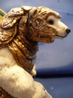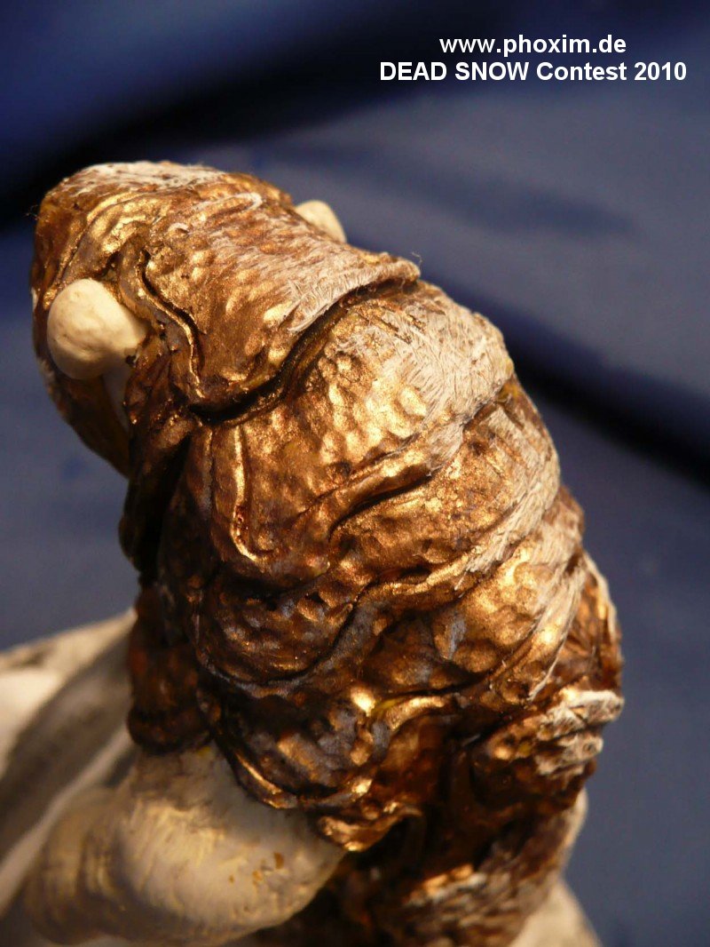 Die Malerei: Die Grundfarbe ist ein Mix aus Revell 94 und 95. (Gold und Bronze). Im Film zwar blasser aber mir gefielen die kräftigen Töne besser. Auch in Hinblick auf ein Foto, das ich in Google gefunden hatte. Dies sollte meine Figur nämlich noch aufwerten… Dann wurde mit wasserverdünnter schwarzer und Umbra-Acrylfarbe ein Washing gemacht um die sehr glänzende Rüstung plastischer zu machen und etwas zu altern. Mit weißer Acrylfarbe kamen noch ein paar sehr trockene Aufhellungen auf die höchsten Punkte des Panzers. |