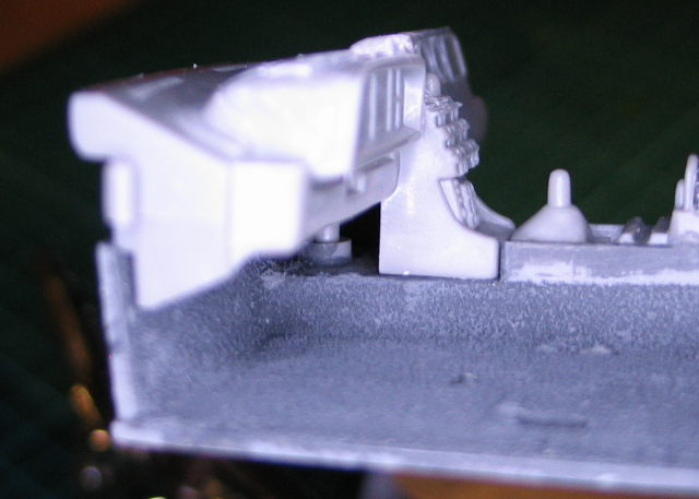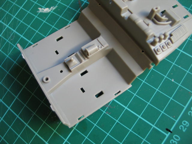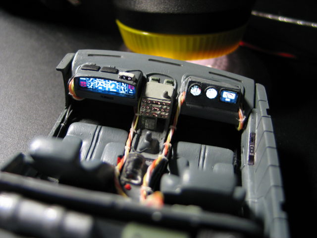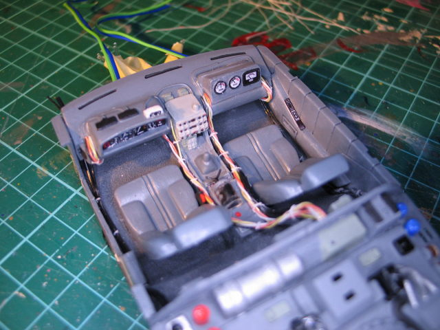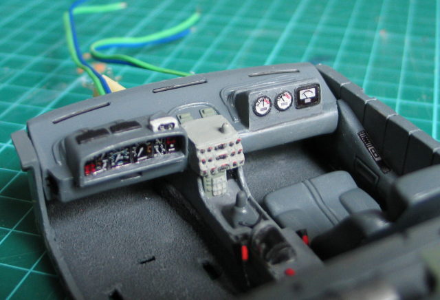 Eingebaut ist eine in der Dachkonsole (ein Abguß in glasklarem XOR-Harz) und als Deckenbeleuchtung (wer genau hinsieht, findet deinen kleinen gelben Punkt im Grau...)