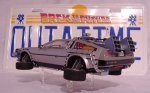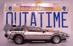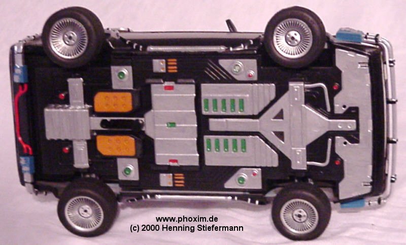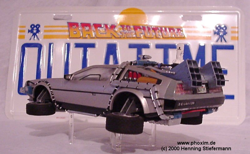 Diese sechs Bilder zeigen einen DeLorean im Masstab 1:24, der aus einem AMT ERTL Bausatz gebastelt wurde. Das Modell verfügt über einen mechanischen Schieber an der Unterseite, mit dem man alle vier Räder des Modells von der normalen Fahrposition in Flugstellung bringen kann! Das Modell stellt das Fahrzeug in der Version aus den ersten beiden " Zurück in die Zukunft " (Back to the Future) Filmen dar. Im zweiten Teil trug es lediglich ein futuristischeres Barcode-Kennzeichen, dass an dem zweiten Modell, das ich gebastelt habe, zu sehen ist. Hier ist es noch das legendäre " OUT A TIME " - Kennzeichen ! |