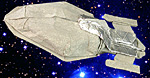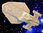 | Die Voyager entstand aus einem quadratischen Stück Schokoladen- Einwickelpapier. Das Modell wurde nur gefaltet, ohne Einschnitte oder Kleben. Das Einwickelpapier, das auf der einen Seite Alu-Folie und auf der anderen Papier hatte, war 21,4x21,4 cm groß. | |