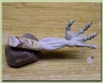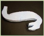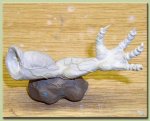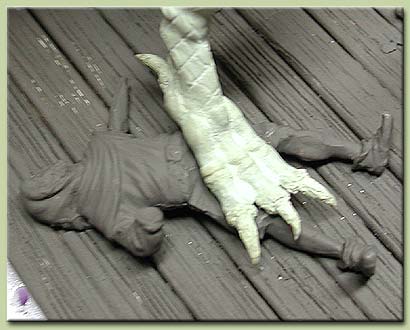 Bild 1-5 zeigt, dass der Körper aus einer Hartschaumplatte ausgeschnitten wurde, um die Körpergröße und Körperhaltung entstehen zu lassen. Auf diese Grundform wurden nun mit Milliput Körper, Kopf und zuletzt die Bauchschuppen modelliert. |