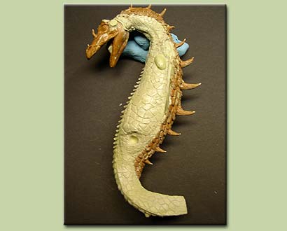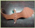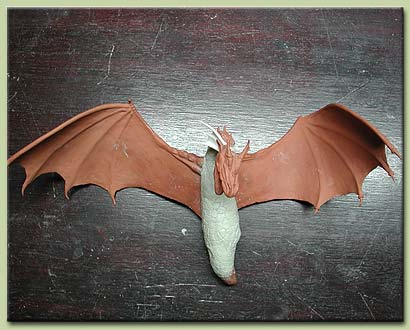 Bild 9-10 zeigt den Drachen mit seinen vorgeformten Flügeln. die Flügel wurden aus Plastikplatten herausgeschnitten und gefräßt. Die geschwungene Form wurde durch Hitzeeinwirkung erreicht. Zuletzt wurde mit Milliput die Knochenstruktur aufmodelliert. |
