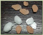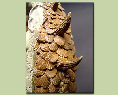 Bild 6-8 zeigt die Rückenschuppen. Hier habe ich Urmodelle aus weichen Plastikplatten in verschiedenen Größen hergestellt. Diese wurden nun alle mit einer Oberflächenstruktur versehen und dann abgeformt. Jetzt konnten die Schuppen aus Resin hergestellt werden. Durch Erwärmung wurde jede Schuppe einzeln dem Drachenrücken angepasst. So wurden ca. 200 Schuppen übereinandergelegt. Zwischen die Schuppen kamen noch die Rückenstacheln. Diese wurden aus weichen Kunststoffröhren geschnitzt und dann geschliffen. |