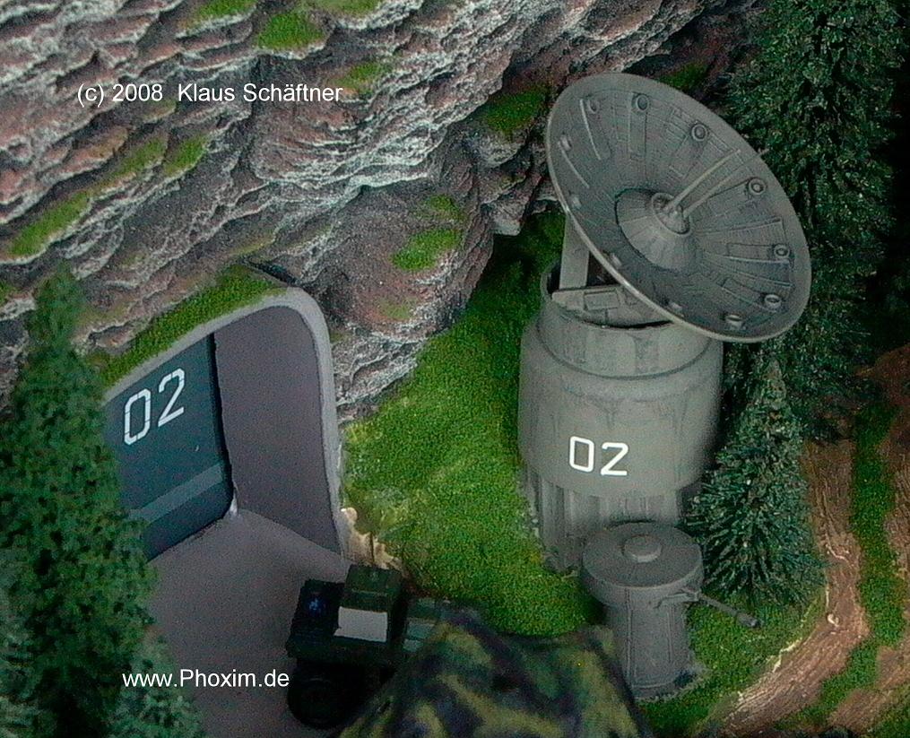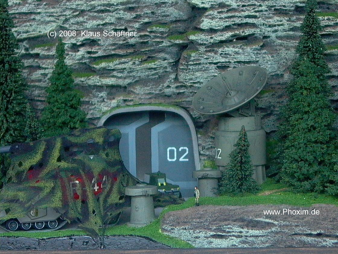 Modellfarbe mit einem kurzborstigen Pinsel aufstupft. Der Tunneleingang wurde aus dicker Pappe geformt, Geschütze und Radarschüssel aus Star