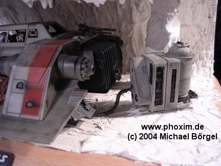 Das Zubehör: Die Plattform für den Snowspeeder besteht aus 10mm Kunststoff und ist eher simpel gehalten, weil man eh nicht viel von ihr sieht. Ich habe sie rundherum leicht angefräßt (ca. 20 Grad) damit sie nicht ganz so kantig wirkt und zusätzlich 4 Alurohre eingesetzt. Auf den 4 Rohren ruht der Snowspeeder. Die Tankanlage ist komplett scratchgebaut. Als Vorlage diente mir eine Konzeptzeichnung aus dem Buch "Das StarWars Universum". Den Tankschlauch habe ich aus einer 3mm Gewindestange zurechtgebogen |
