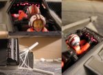 Zusätzlich habe ich das Cockpit mit Lichtwellenleitern ausgestattet. Die Lichtwellenleiter (ca 30 Stück) habe ich 50/50 auf zwei Leuchtdioden verteilt (binken abwechselnd) Die Elektronik stammt aus einem alten Babyspielzeug meines Sohnes (Danke Michel !!!). |