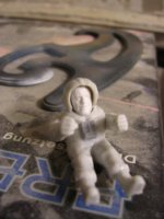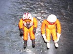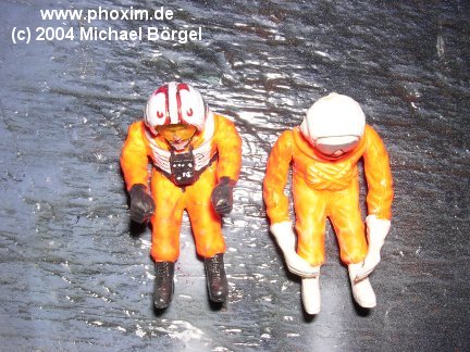 Fangen wir mit den Pilotenfiguren an: Die sahen einfach furchtbar aus. Zu lange Arme,merkwürdiges Gesicht irgendwie nicht StarWars-like. Zuerst habe ich mit dem Dremel die Gesichter herausgefräst,so daß nur noch der Helm übrig war. Die Gravuren auf den Helmen habe ich mit einem Cutter vertieft. Nach den Feinarbeiten habe ich die Helme vom Rumpf getrennt. Die Arme habe ich beim Ankleben hinten um ca. 1/3 der Länge überstehen lassen. Den Überstand habe ich nach dem Aushärten weggeschnitten und anschließend alles abgerundet. Den Absatz zwischen Ärmel und Handschuhen hab ich dann vorsichtig weggefräßt, weil diese nach dem Kürzen der Arme natürlich viel zu lang erschienen. Das Teil auf dem Bauch (sieht aus wie ein Fallschirm) habe ich ebenfalls weggefräßt und eine Sani-Tasche aus einem 1:35 Soldatenbausatz aufgeklebt. |