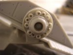 Die Laserkanonen habe ich ebenfalls aufgebohrt und die Raketenwerfer aus einem Hubschrauber in 1:72 eingebaut. Die Gravuren am Vorderteil der Kanonen habe ich mit einem Cutter vertieft und noch einige kleine Teile aus der Restekiste angebracht. |
