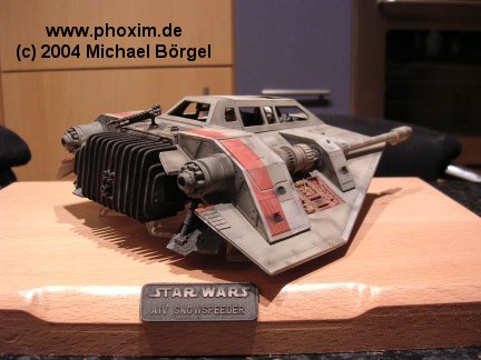 Während der Bauzeit sind mir noch andere Dinge in Sachen Umbau eingefallen, ich konnte sie aber nicht mehr umsetzen, weil das Modell schon lackiert war. ch werde das aber beim nächsten ( ja,ich hab noch einen;)) Snowspeeder mit reinnehmen. Auf den Fotos sieht man den Snowspeeder auf der noch unfertigen Base (Buche 25mm). Der Ständer ist nicht lackiert, weil er später keine Verwendung findet. Ebensowenig das Star Wars-Schild vorne an der Base. |
