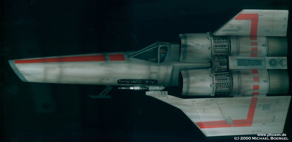 Die Abziehbilder habe ich weggelassen. Dafür habe ich sie auf Maskierfilm übertragen und direkt auflackiert. Sieht besser aus, da Abziehbilder meistens feine Gravuren überdecken. Die Brand- und Verschleißspuren habe ich wie immer mit der Airbrush aufgetragen. Leider bleibt die Viper nicht in meinem Besitz, sondern wird in einem , teilweise computeranimierten Galactica-Film Verwendung finden. Bei diesem Film handelt es sich um ein hobbymäßiges Projekt ( in etwa wie TROOPS ) und hat nichts mit der geplanten Galactica-Neuauflage von Glenn Larson zu tun. |