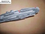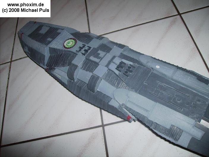 oder: ein erfolgreicher Fehlschlag. Ich bezeichne dieses Modell als einen Fehlschlag, da mir einige Fehler unterlaufen sind. Aber zugleich auch als Erfolg, da ich schon an einem Folgemodell arbeite bei dem ich die Fehler ausgemerzt habe. Man könnte dies also als Prototyp bezeichnen. Das Modell der Galactica besteht komplett aus Pappe und da war schon mein erster Fehler. ich hatte zwei streifen Pappe übereinandergeklebt, zurechtgeschnitten und habe sie als Basis verwendet um alles weitere darauf zu bauen. Leider verzog sich der Pappstreifen. |