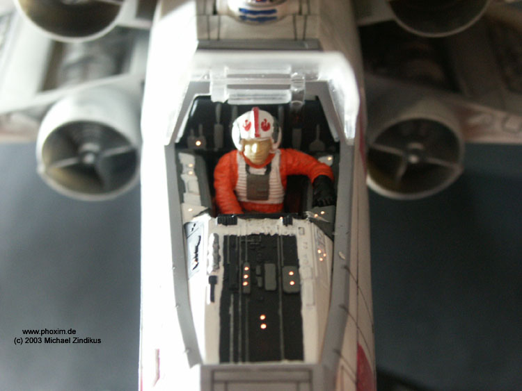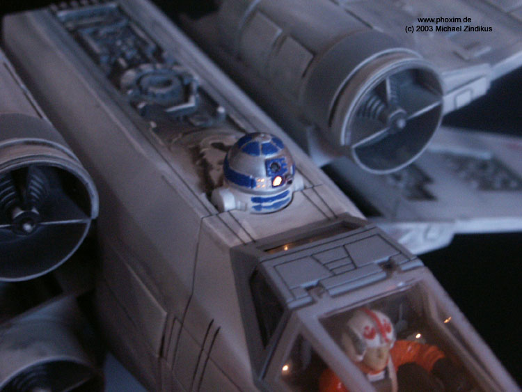 Deshalb habe ich diese durch den zusätzlichen Einbau von Lichtwellenleitern ergänzt. Sogar R2D2 hat bei der Gelegenheit sein eigenes Licht abbekommen. Alles in allem muss ich sagen, dass die Qualität dieses Bausatzes sehr hoch ist, besonders was die Passgenauigkeit angeht. |