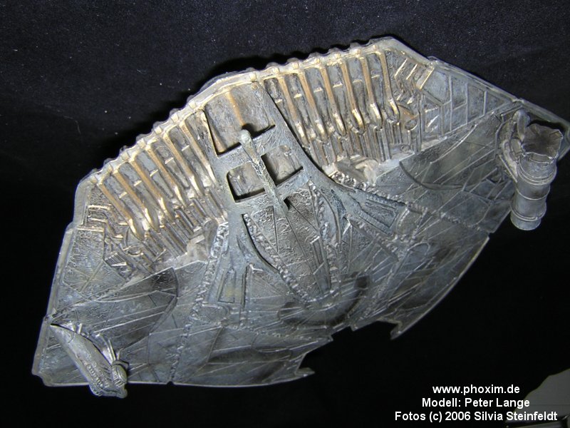 gehalten. Für die Bemalung habe ich ausschließlich Revell-Farben benutzt. Mit Airbrush habe ich das Modell in verschiedenen Grautönen grundiert und die Vertiefungen mit dunkleren Schattierungen nuanciert. Danach folgte ein Dry-Brush mit einem helleren Grau und Sandfarben, um einen gebrauchten Eindruck zu erwecken. Zum Konservieren habe ich eine gute Schicht matten Klarlack von Revell aufgetragen. Erst danach ein letztes Dry-Brushing mit Eisen, Gold und Silber, um metallische Effekte zu erzeugen. |