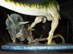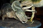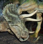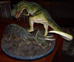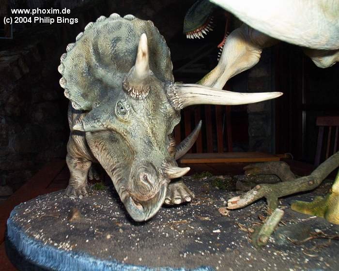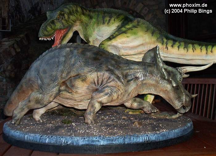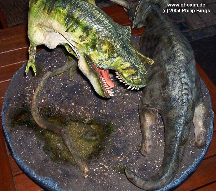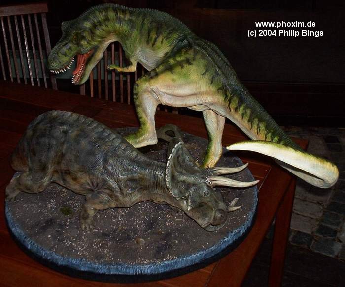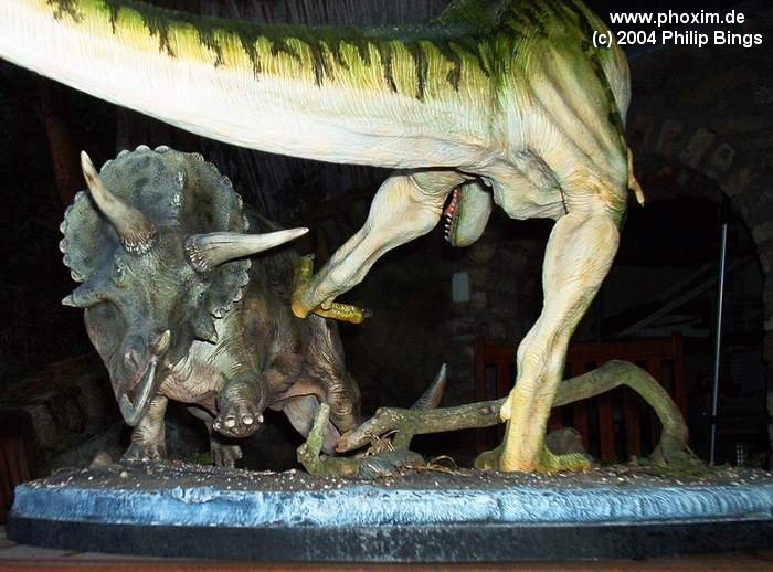 Durch den Einsatz des Blitzes wird irgendwie alles glänzend :-( Egal stellt euch vor sie glänzen nicht :-))) Um nochmal jurz auf die Größe einzugehen: Der T-Rex ist ca. 1 Meter lang und der Triceratops ca. 70 cm. |