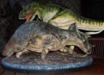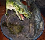Um genau zu sein ist es sogar der Triceratops von Achim Schulz, denn er hat das Diorama vor einigen Monaten an mich weitergegeben. Den T-Rex besitze ich schon einige Jahre und habe ihn schon fast genauso lange fertig gebaut und bemalt. |
