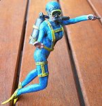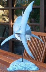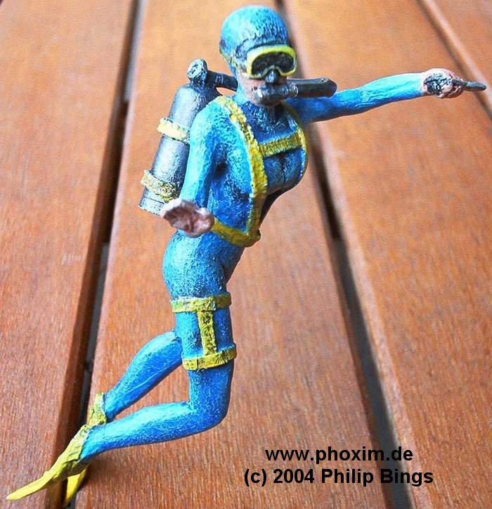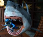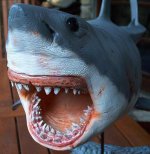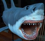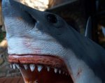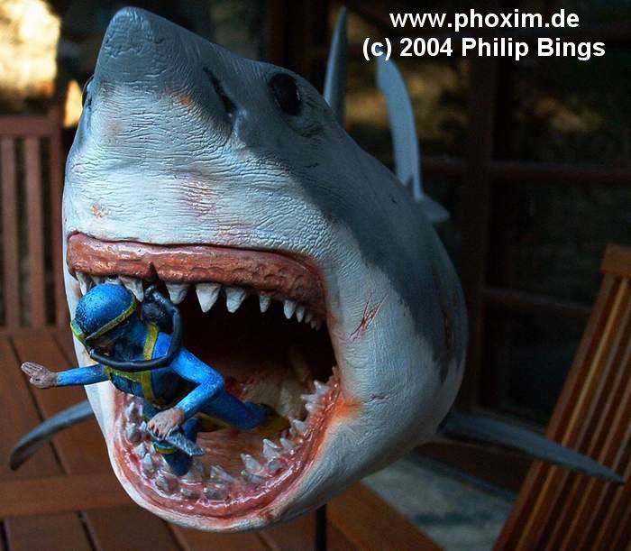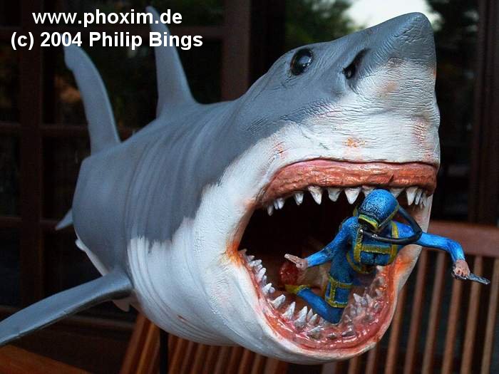 Der Hai selbst ist absolut riesig (ca. 1 Meter lang). Material: Resin. Mitgeliefert werden eine Taucherin und ein "Stück" Leiche. Wahrscheinlich ein armer Surfer, hehe. Die Base auf der der Hai trohnt ist der Zahn des Urhais Chararodon Megalodon. Eine witzige Idee für eine Base :-) Der Hai selbst ist relativ einfach zusammengebaut da Resin wie immer selten verzogen ist. Die Zähne sind aus "Acrylics", dem Material was auch Zahnärzte für Gebisse verwenden. Bei der Bemalung habe ich mich voll und ganz auf sämtliche Bücher und Filmmaterial aus Dokumentarfilme verlassen. Letzenendes ist es ein beeindruckender Fisch geworden, gegen den Spielbergs Weisse Hai wie eine Sardine aussieht (größentechnisch) :-))) |
