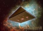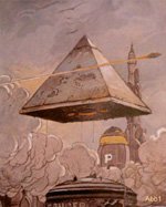 Nach langjähriger Abstinenz vom Modellbau habe ich vor etwa 2 Jahren mit Martin Sängers Bulk Frighter Bausatz wieder mit dem Modellbauen begonnen. Die Kombination von leicht zu Bauen und guter Wirkung hat mir sehr gefallen und ich wollte so was Ähnliches selbst realisieren. Hier also Bilder von meinem ersten Prototyp. Das Modell basiert auf den Zeichnungen des Comic-Zeichners Enki Bilal. Er hat für seine ziemlich schrägen Geschichten um „ Die Geschäfte der Unsterblichen“ dieses Raumschiff entworfen mit dem die alten Götter Ägyptens, allen voran der intrigante Horus, über einem futuristisch, anarchistischen Paris erscheinen und um Sprit für die Weiterreise verhandeln müssen... Als Zeichner tut er sich leicht. In der Totalen sieht man an dem Schiffe keine Details (Abb.1), in den Detailansichten dafür ne ganze Menge (Abb.2). Das lässt viel Raum für eigene Interpretation. |