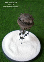 Die Bemalung: Zuerst kam eine Schicht metalizer Titan die ich mit glänzendem Klarlack versiegelte. Nach gründlicher Durchtrocknung folgte ein washing mit Mattschwarz. Das Ganze habe ich dann mit Smoke (Tamiya) abgedunkelt und für den rostigen Look mit Red Brown (Tamiya) eingenebelt. Die "Sensoraugen" wurden von Hand bemalt, ebenso wie die winzigen orange-braunen Markierungen. Zum Schluß noch etwas drybrushing und fertig. |