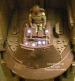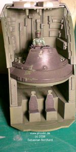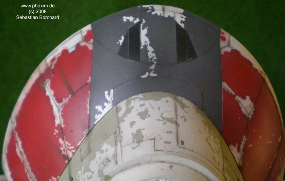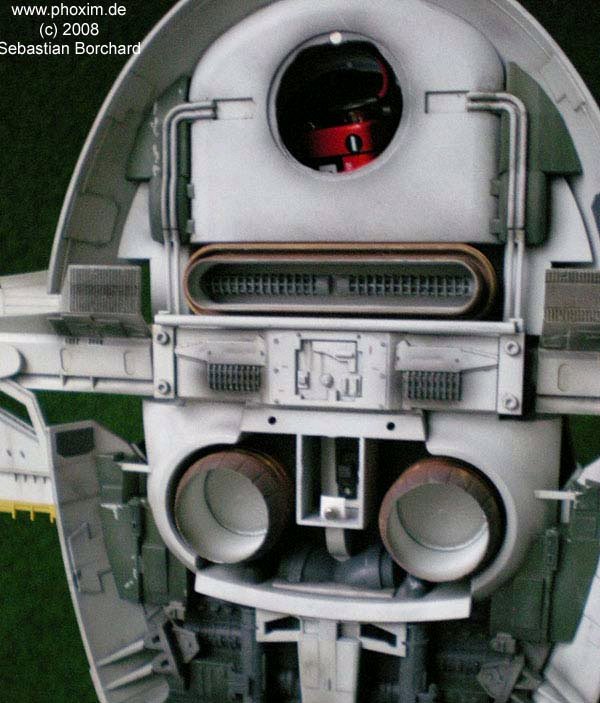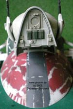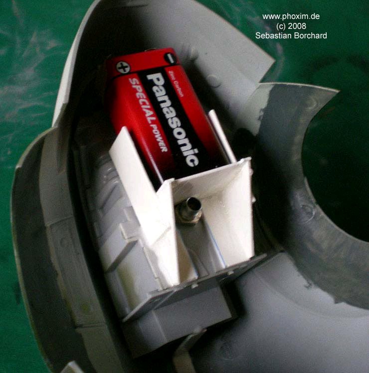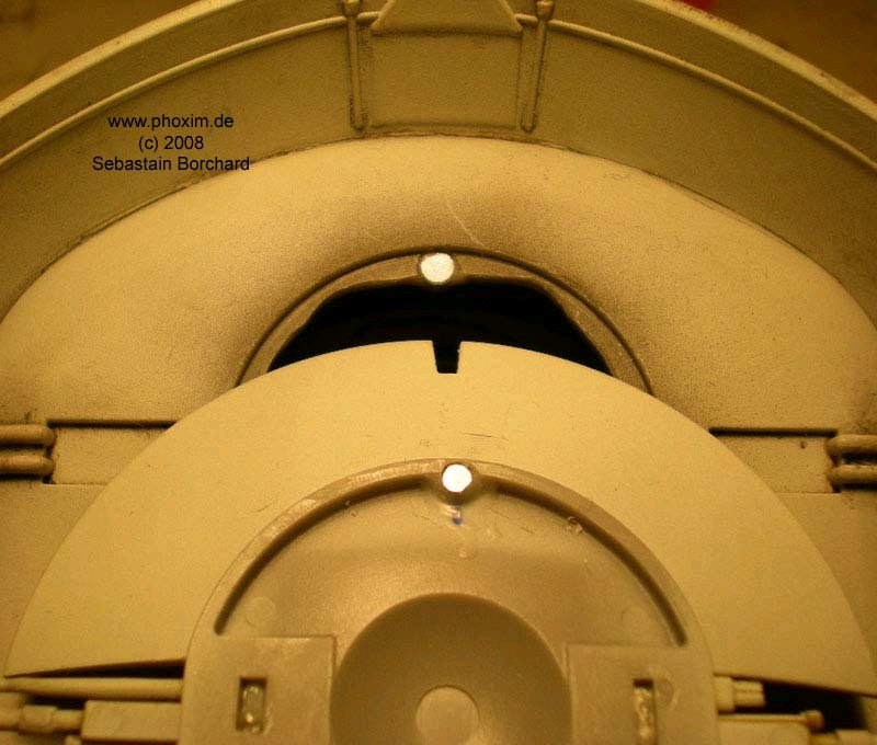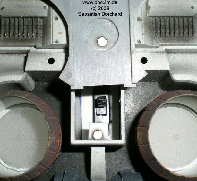 haben, habe ich den Bereich hinter der Radarschüssel (?) ausgefräst. Die Schüssel selbst wird von kleinen Magneten gehalten. Den Ein/Aus Schalter habe ich ebenfalls hinter einem Teil der Rückseite versteckt. Auch hier kamen wieder kleine Magnete zum Einsatz, um das Teil zu halten. |