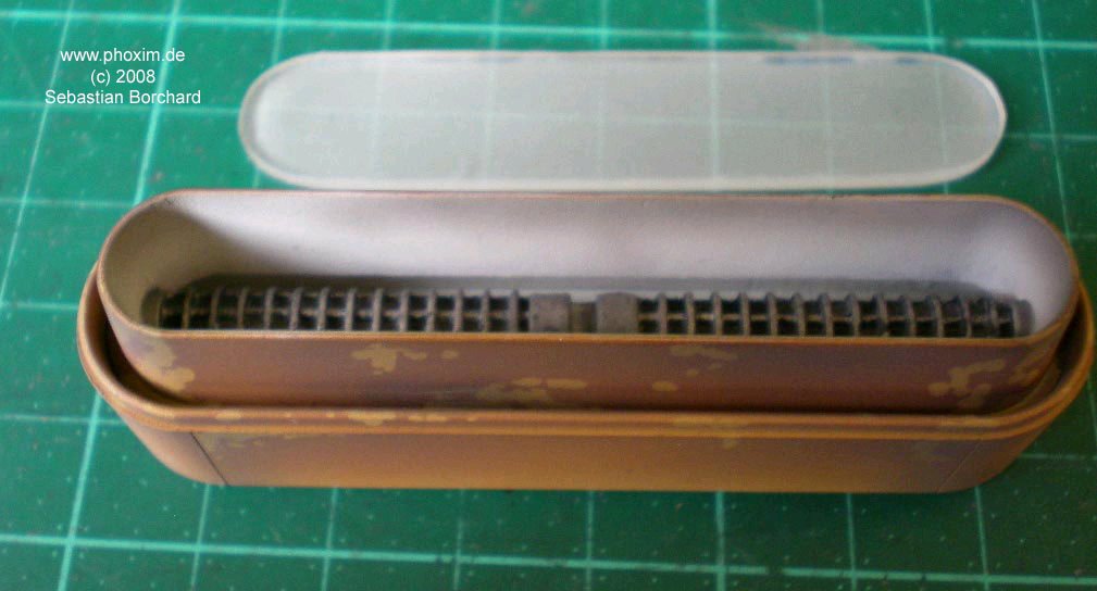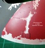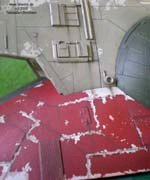 hauchdünne Schicht Hull Red (Tamiya) um das Ganze etwas abzudunkeln. Die dunkelgrauen Streifen sind mit German Grey (Tamiya) gebrusht. |