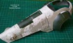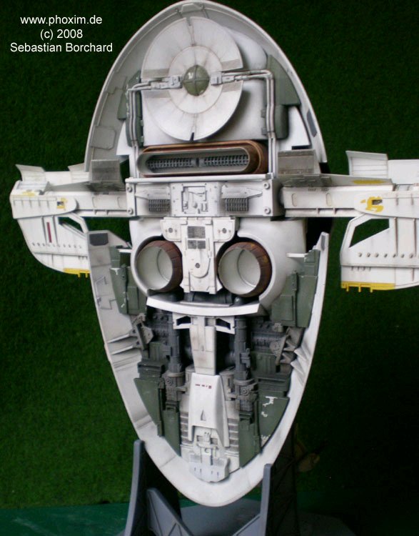 Der Bausatz in 1:72 kommt von der Firma Fine Molds und ist eine leicht abgeänderte Version des Bausatzes von Jango Fett`s Slave I. Beim Vergleich mit Bildern des Studiomodells fällt auf, dass einige Details im Bereich des Cockpits und der Rückseite fehlen bzw. verändert wurden. Trotzdem habe ich den Bausatz, bis auf die Beleuchtung, OOB gebaut. |