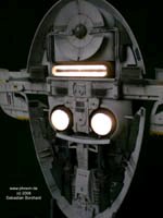 Zur Beleuchtung des Antriebs kamen insgesamt acht weiße 5mm LEDs mit etwas wärmerem Farbton zum Einsatz. Sechs davon für den länglichen, oberen Teil und zwei für die beiden unteren Düsen. Jeweils zwei davon hab ich mit Vorwiderstand in Reihe geschaltet. |
