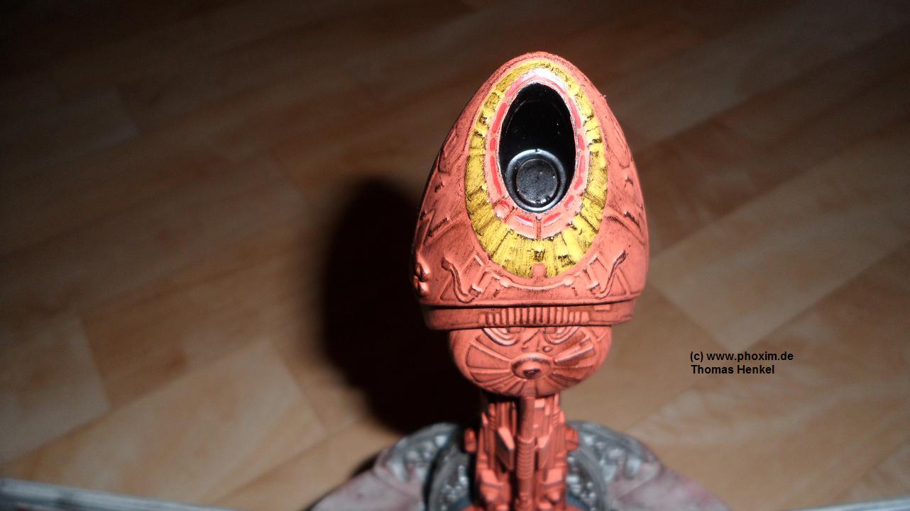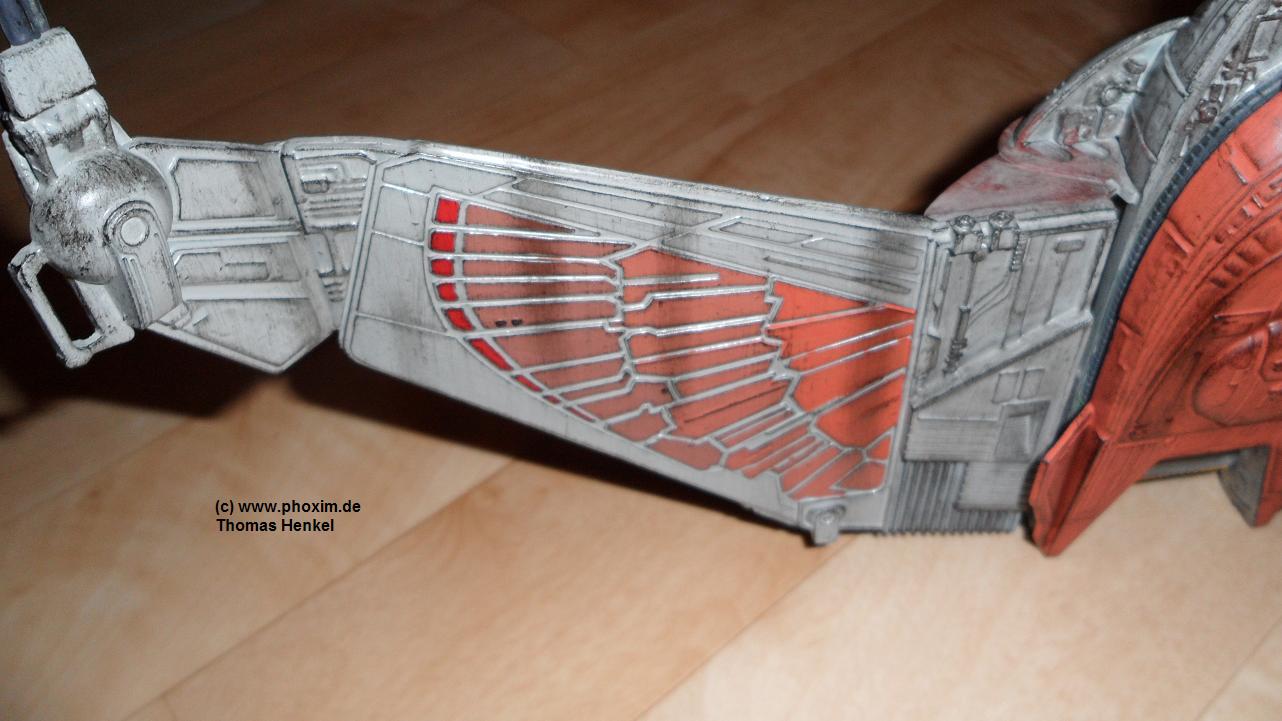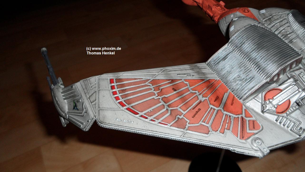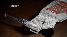 Das Resultat hat mir sehr gut gefallen, auch wenn ich anfangs verdammt skeptisch war. Noch ein paar romulanische Insignien und fertig war`s. Zuletzt bin ich mit etwas Schwarz über das Modell gegangen um Verschleiss und Abnutzung zu simulieren. |