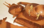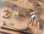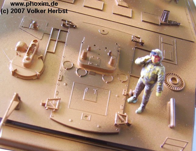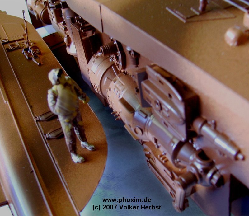 Die dahinter liegenden 4 Klappen sind normalerweise die Abschußöffnungen für Raketen, in dieser Variante als Transporter bleiben sie verschlossen, darunter befinden sich die neu eingebauten Kojen des S.E.K.s. Ich denke es ist ein interessantes Teil geworden und - bitte verzeiht mir die schlampigen Figuren - die dienen nur zur Größenorientierung. |