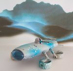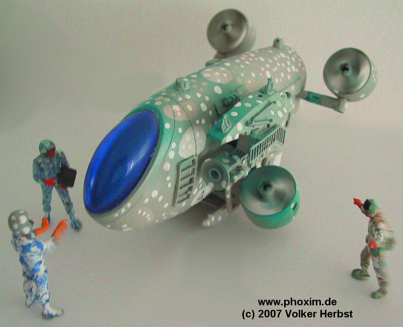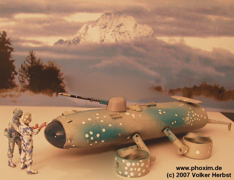 Modell 1: Der Propellergetriebene Laserschlitten (F.A.1) “Marker”. Zweisitziger, über 4 Propellergondeln angetriebener, schneller Kufenpanzer der als Gefechtsfeldleiter dient. Die Gondeln sind nach allen Seiten schwenkbar, sodaß die Kiste auf engstem Raum zu manövrieren ist. Durch die äußere, Radarabweisende Außenhaut und damit verbundene schwere Ortung, kann sich dieser Kampfschlitten sehr nahe an Stützpunkte der Erdallianz heranwagen. |