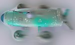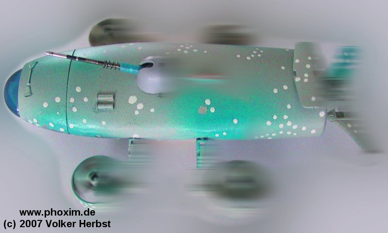Modell 2: Ferngesteuerter, unbemannter Propellergetriebener Waffenträger (F.A.2) “Sleeper”. Radar- und Kameraführung in der Nase. Motoren- und Gondelsystem wie F.A.1. Bei richtiger Konfiguration der Gondeln fliegt der Schlitten, sodaß man hier mehr von einem Fluggerät sprechen muß. |