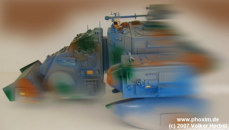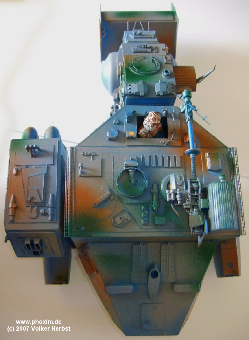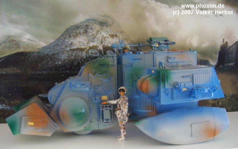 Rebellen von Oilstar haben Zulauf und schon die Jugend schlägt sich wacker gegen die Erdeindringlinge. So entstehen auf beiden Seiten immer wieder neue Kriegsmaschinen. Das Teil hier heißt „Iceduck“, und ist ein von der Allianz auf Oilstar entwickelter gut gepanzerter und durchschlagskräftiger Patroltank. |