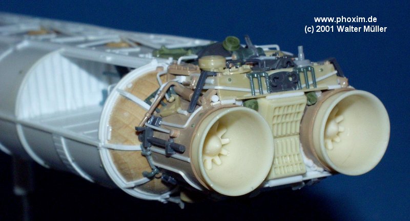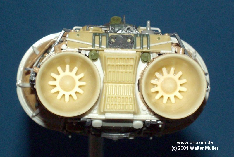 Der Cylonentanker wurde nach den mir zur Verfügung stehenden Originalfotobilder (die nicht sonderlich gut waren) nachgebaut. Der Modellmaßstab liegt so bei 1:1200. Der gesamte Rumpf sowie die Feinteile sind aus Polystyrol aufgebaut, da diese Verklebungen sehr haltbar sind. Am Rumpf ist noch die mittlere Unterseite mit Feinteilen zu versehen. Der Kopf ist noch nicht fertig. |