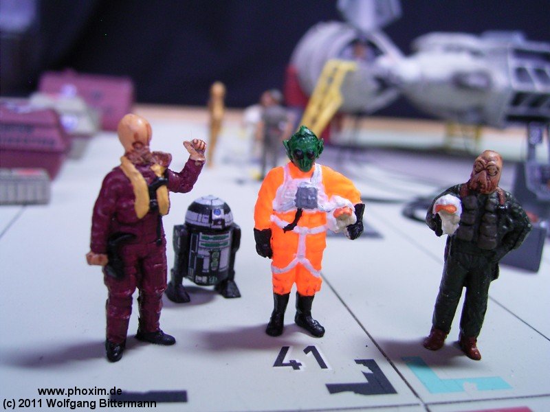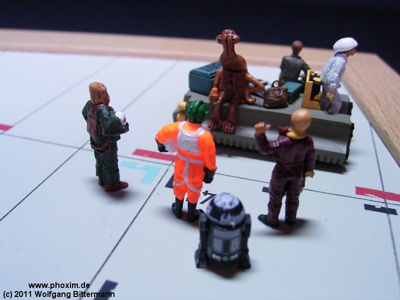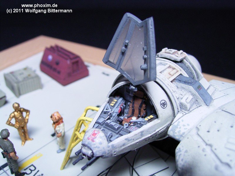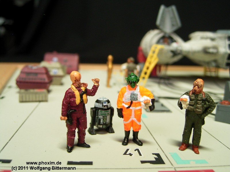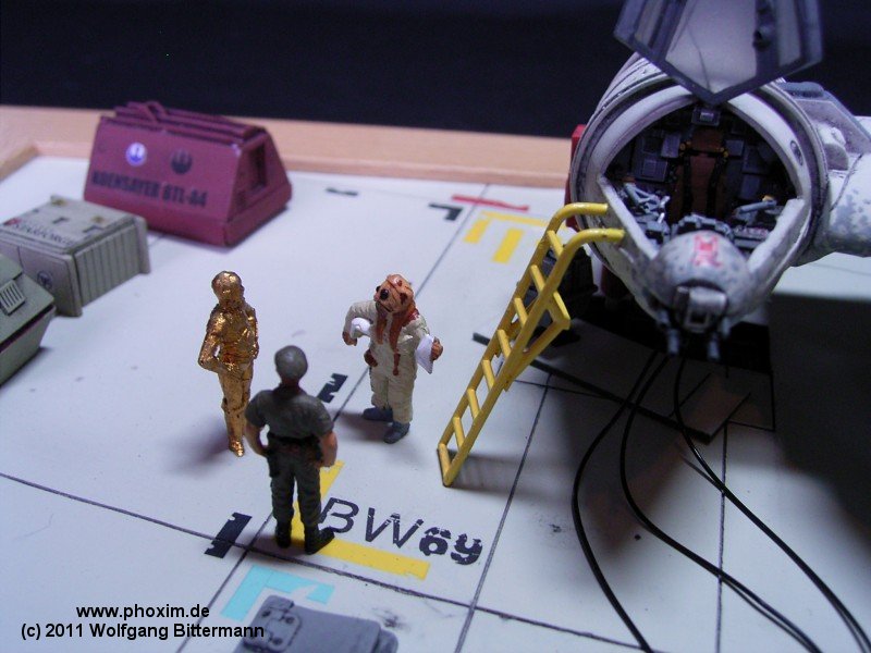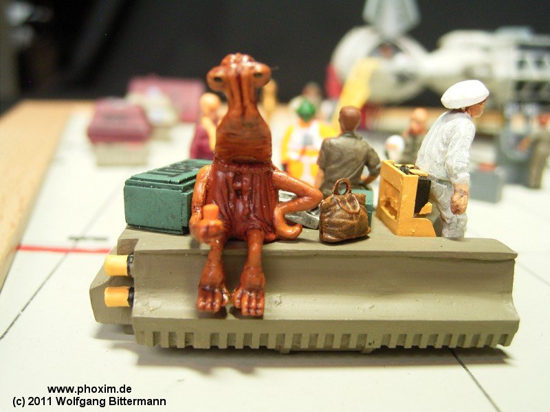 Auf dem Personaltransporter hier sitzt übrigens Hammy der Ithorianer. Hammy bleibt normalerweise in seinem Haus auf Tatooine aber zu diesem Anlass ist er mal rausgekommen um sich den B-Wing Bomber mal anzusehen. Wenn Ihr mehr über Hammy erfahren wollt, besucht ihn mal auf seiner Homepage: |