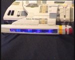Mit eingebauter, im Originalbausatz nicht enthaltener Beleuchtung: in jeder Warpgondel sind 4 blaue und 3 rote LED´s und im Sensoraufbau nochmals 2 blaue und 2 gelbe LED´s (mit passenden Vorwiederständen) eingebaut. Die Eingansspannung liegt bei 4,5 - 6 V. |