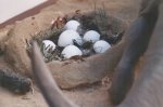 Wie man auf den Fotos sehen kann, habe ich auch ein Nest mit Dinoeiern gebaut. Die Eier sind Plastikostereier, die ich halbiert habe. Das Nest und die Sandebene sind aus Gips. Ich habe dann noch Sand auf den feuchten Gips gestreut und nach dem Trocknen mit Desert Yellow Farbe besprüht. |