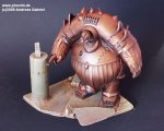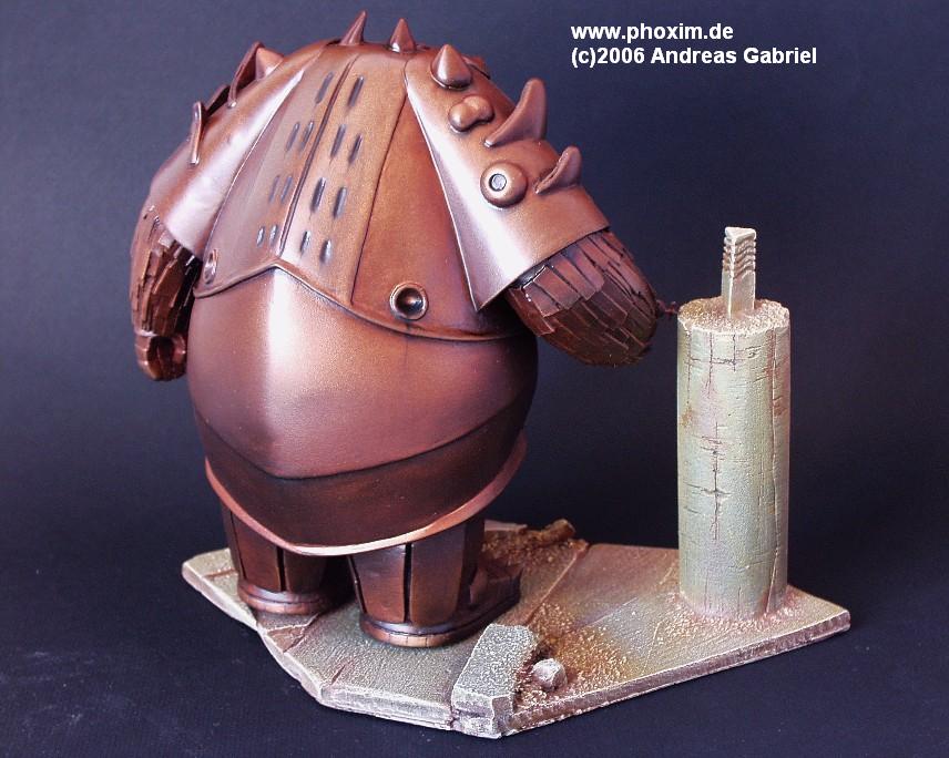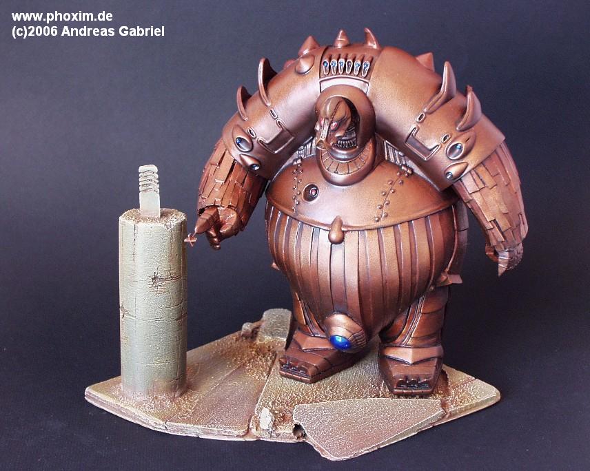 Auf eine Grundierung mit matt schwarzem Lack folgte eine Lage mit Boltgunmetal aus dem Warhammershop. Der rötliche Ton kommt durch Ölfarben zustande… vielleicht ein bisschen zu rot… die Schattierungen habe ich mit Sepia gemalt und die blauen Knöpfe sind mit clear blue von Revell gemalt worden. |