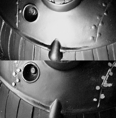 Bei meinem Modell waren die Nieten auf dem Bauch nicht so gut zu erkennen. Ich habe sie dann durch feine Nägel ersetzt. Der Körper des Kits ist hohl, sodass man einfach durchbohren und die Nägel einsetzen kann. |