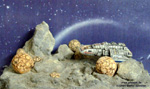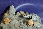 | Das zweite Bild zeigt das Dio von oben. Bei dieser Aufnahme kommen die wirklichen Farben des Dioramas deutlicher zur Geltung, also eher graue Farbtöne als gelblich/bräunliche. Natürlich wurde das Runabout mit Farbe (Humbrol etc.) nachbehandelt, genau wie die übrige Planetenoberfläche. Die Landschaft wurde mit feinstem Sand überstreut und mit Mehl aufgehellt. (Mehl ist genial fein und läßt sich optimal verpinseln). | |