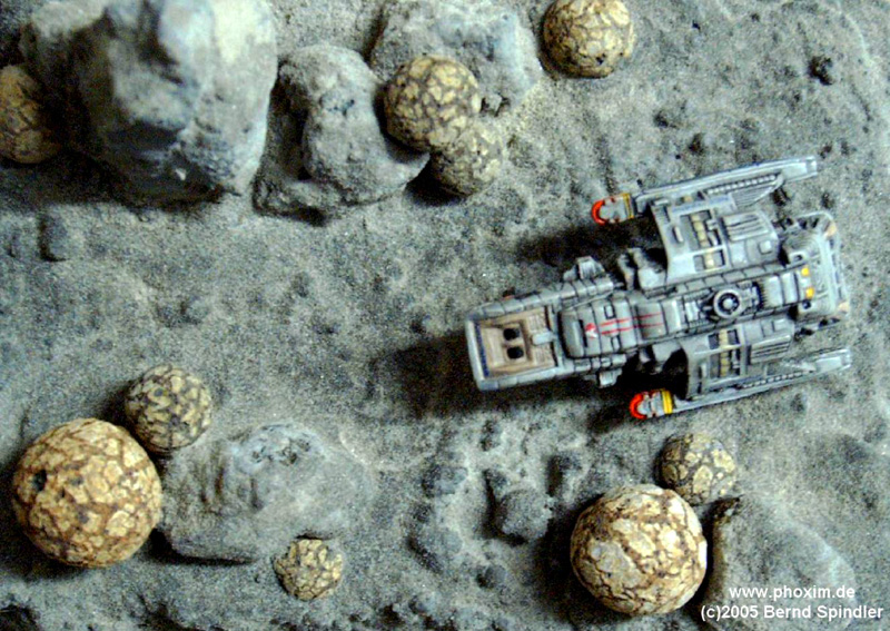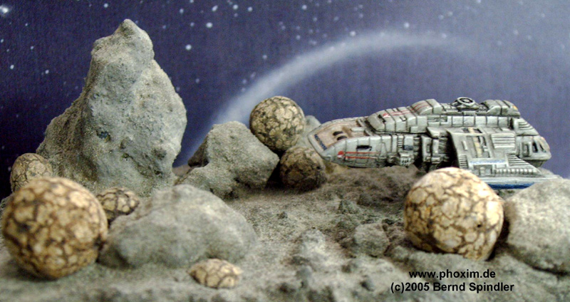 | Das nächste Bild zeigt eine etwas andere Ansicht des Landemanövers der U.S.S. Rio Grande (nenne ich jetzt einfach mal so). Die beige/hellbraunen Schattierungen der Felsen bestehen aus Lavasteinstaub, den ich durch Zerstoßen bzw. Zermalen von selbstgesammelten Lavasteinen selbst mache. So besteht das ganze Diorama fast aus Natur pur ;-) | |